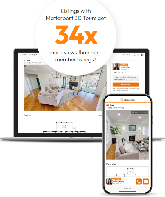 Listings with Matterport stand out amongst the pack thanks to razor sharp images and detailed floor plans. Think of it as a 24/7 open house that lets buyers walk the property before they even see it. Also, listings on Homes.com with a Matterport virtual tour sort to the top of search results which gives them a big advantage. So, when it comes to selling your home faster and for more money, Matterport definitely matters.